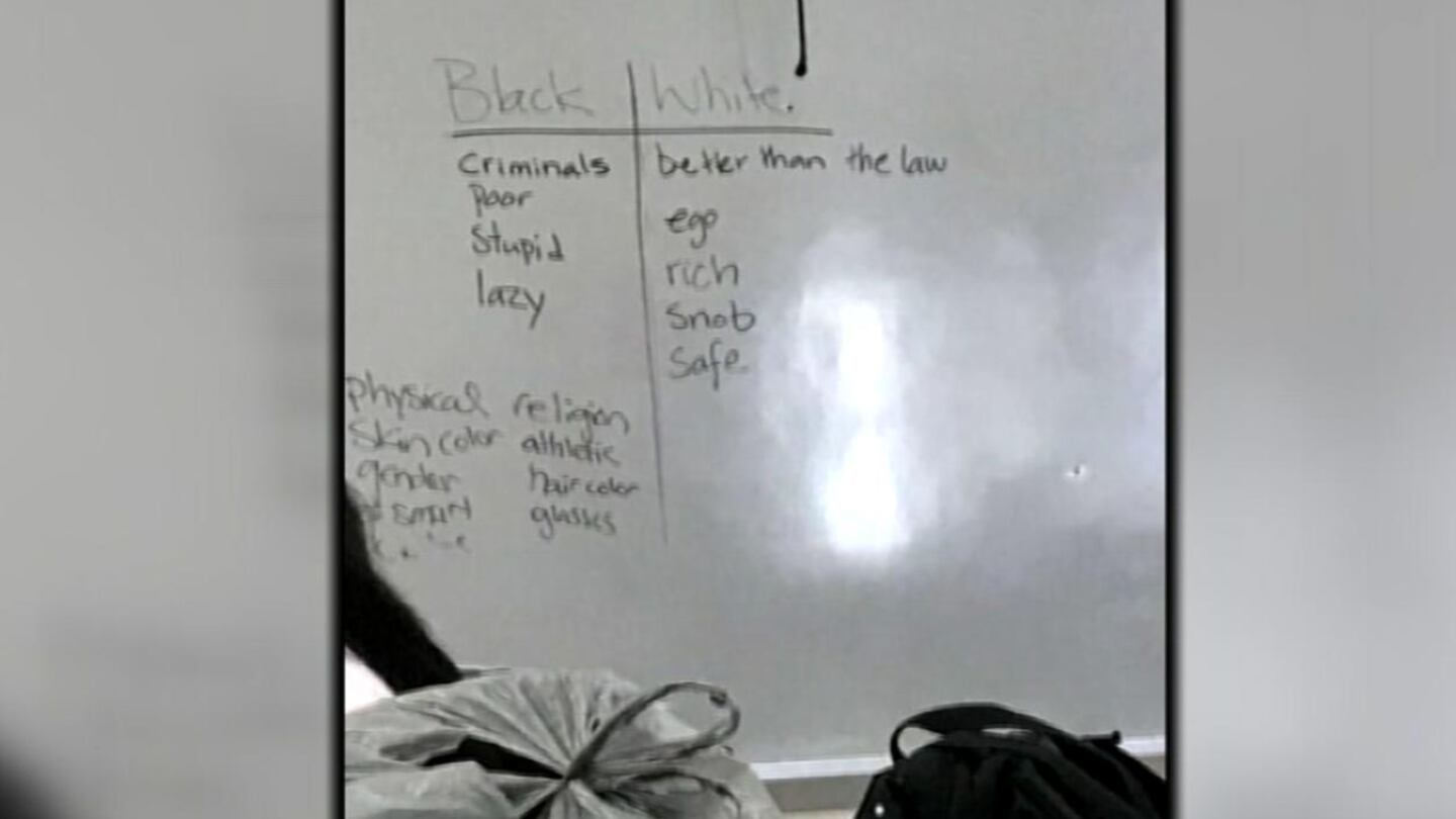 The picture shows words like "criminals" and "lazy" under black and "better than the law" and "snob" under white.