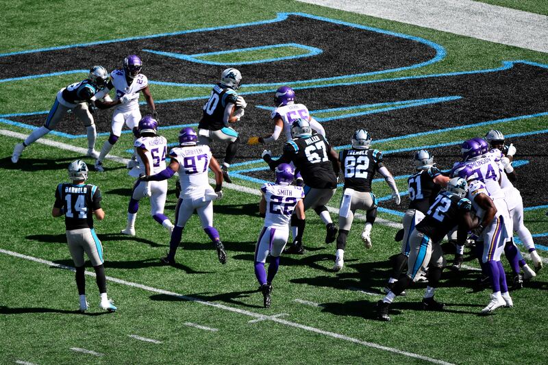 Minnesota Vikings v Carolina Panthers CHARLOTTE, NORTH CAROLINA - OCTOBER 17: Chuba Hubbard #30 of the Carolina Panthers scores a touchdown during the first quarter against the Minnesota Vikings at Bank of America Stadium on October 17, 2021 in Charlotte, North Carolina. (Photo by Mike Comer/Getty Images) (Mike Comer/Getty Images)
