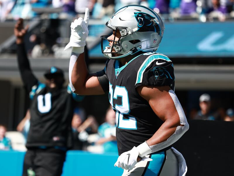 Minnesota Vikings v Carolina Panthers CHARLOTTE, NORTH CAROLINA - OCTOBER 17: Chuba Hubbard #30 of the Carolina Panthers scores a touchdown during the first quarter against the Minnesota Vikings at Bank of America Stadium on October 17, 2021 in Charlotte, North Carolina. (Photo by Grant Halverson/Getty Images) (Grant Halverson/Getty Images)