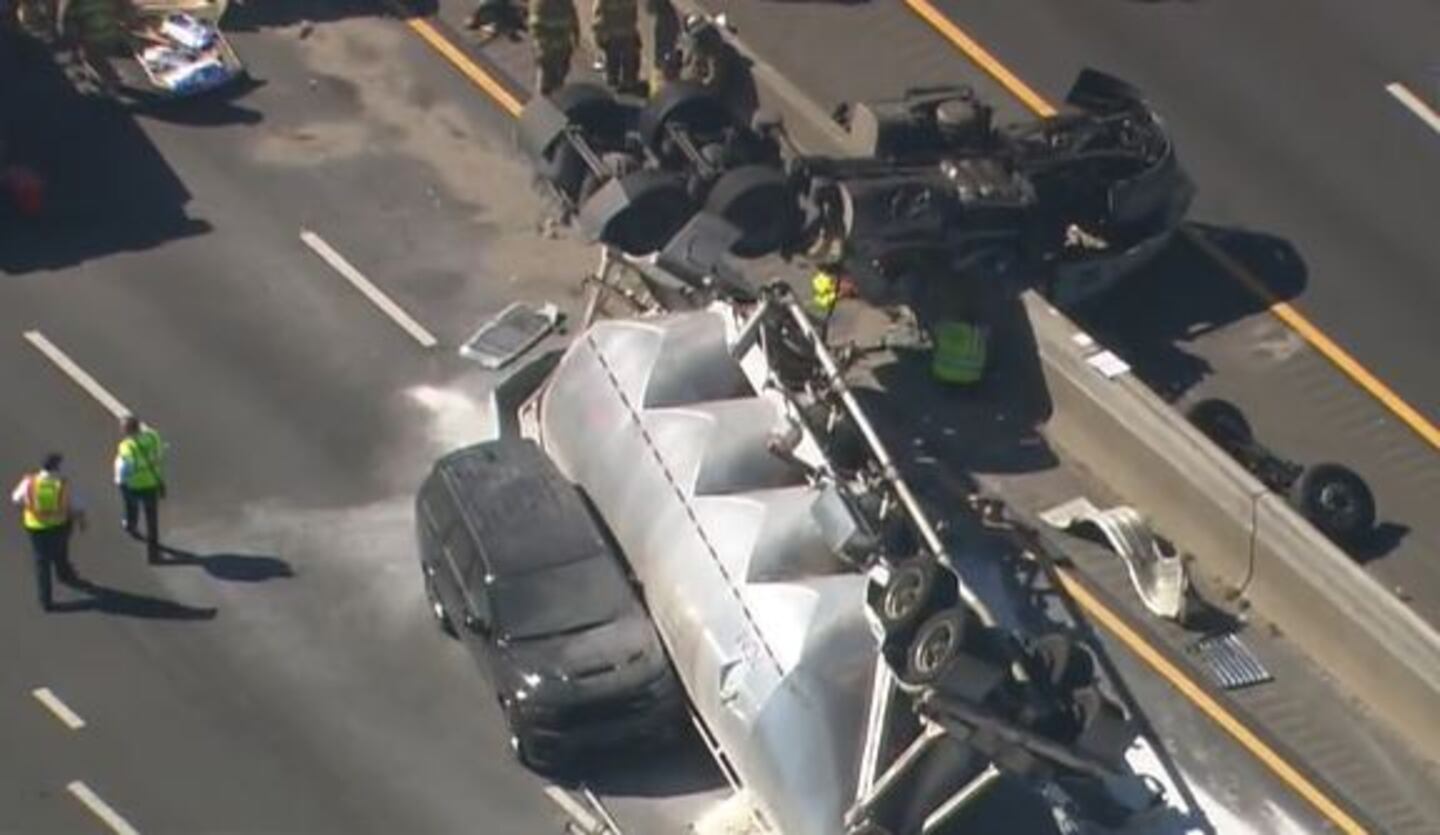 Chopper 9 Skyzoom flew over the scene and could see the dry-bulk tanker on its side. Two other vehicles looked to also be involved in the wreck.