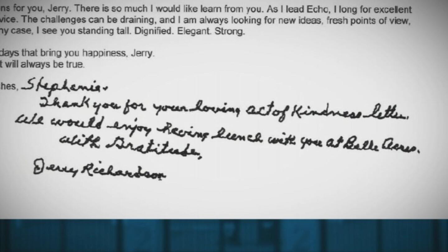 At the bottom of the email was a handwritten message from Richardson to Ansaldo, saying, "Stephanie, thank you for your loving act of kindness letter."