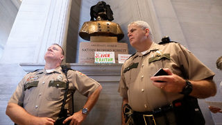 (Troopers stand guard at the bust of Nathan Bedford Forrest)