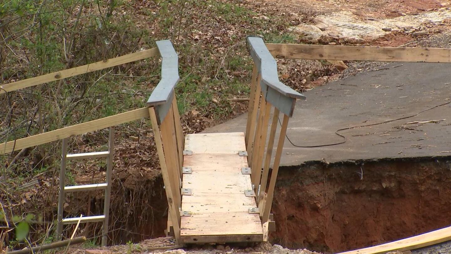 They built a foot bridge to walk to their cars after a private road at the end of Jordan Drive was swept away.