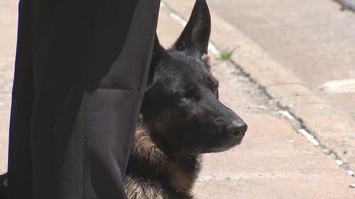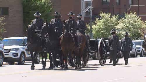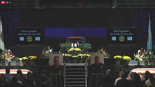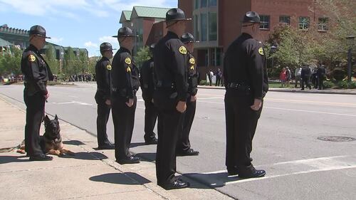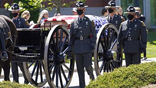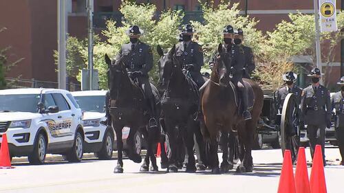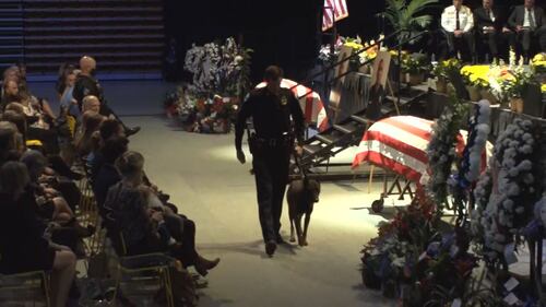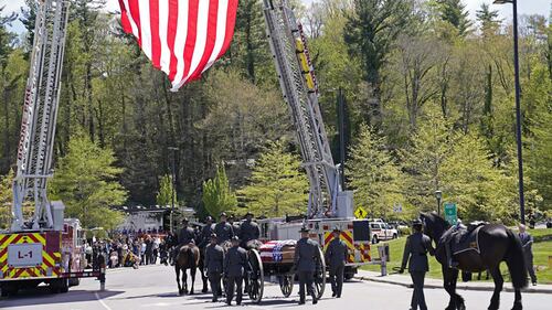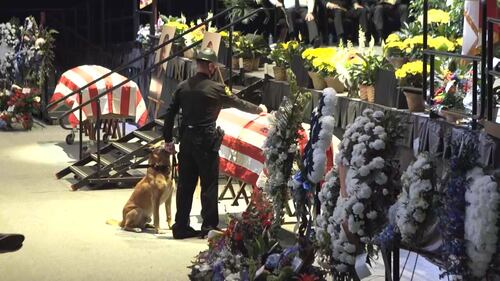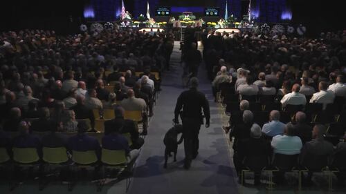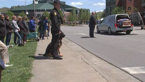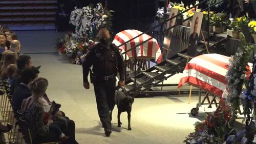 Fallen deputies funeral A processional approaches the Holmes Convocational Center for the funeral services of Watauga County Sheriff's Deputies Sgt. Chris Ward and K-9 Deputy Logan Fox in Boone, N.C., Thursday, May 6, 2021. The two deputies were killed in the line of duty. (AP Photo/Gerry Broome) (AP)