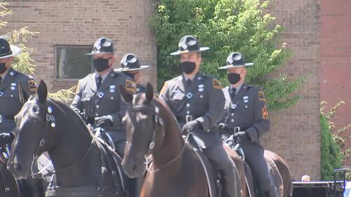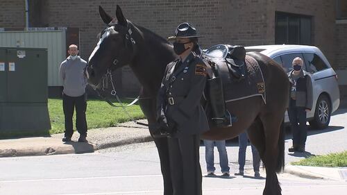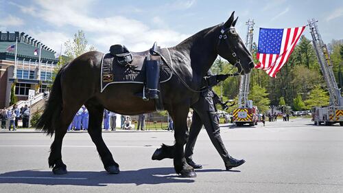 Fallen deputies funeral A riderless horse approaches the Holmes Convocational Center for the funeral services of Watauga County Sheriff's Deputies Sgt. Chris Ward and K-9 Deputy Logan Fox in Boone, N.C., Thursday, May 6, 2021. The two deputies were killed in the line of duty. (AP Photo/Gerry Broome) (AP)