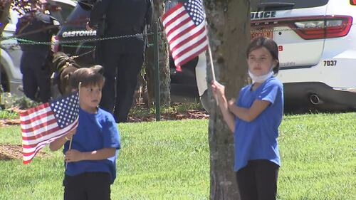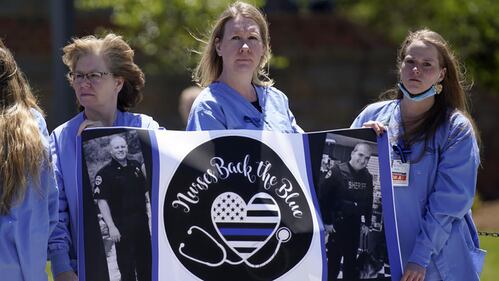Fallen deputies funeral Nurses watch as a processional approaches the Holmes Convocational Center for the funeral services of Watauga County Sheriff's Deputies Sgt. Chris Ward and K-9 Deputy Logan Fox in Boone, N.C., Thursday, May 6, 2021. The two deputies were killed in the line of duty. (AP Photo/Gerry Broome) (AP)