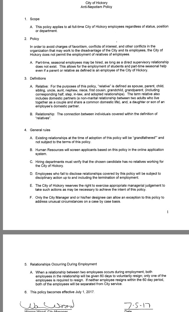 The policy prevents brothers, sisters, uncles, aunts, cousins and even grandparents from working for the city of Hickory at the same time.
