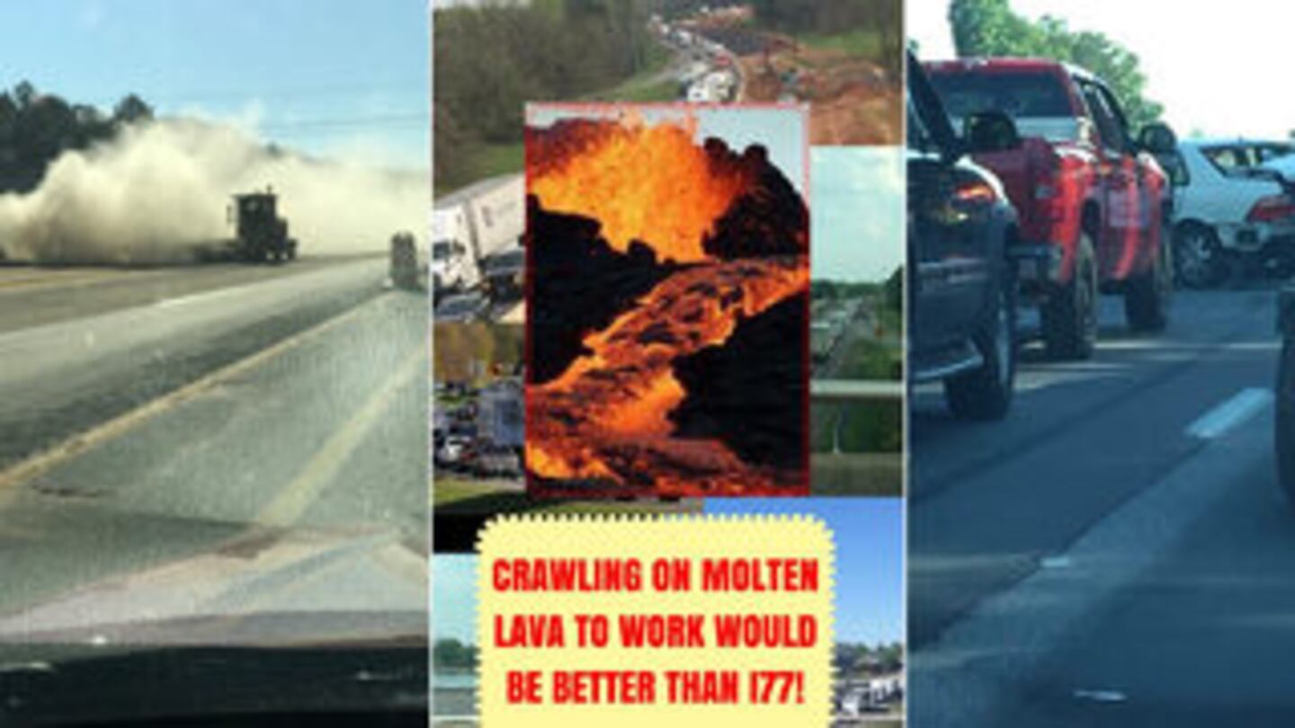 The photo is of I-77 traffic with the caption “Crawling on molten lava to work would be better than I-77.”