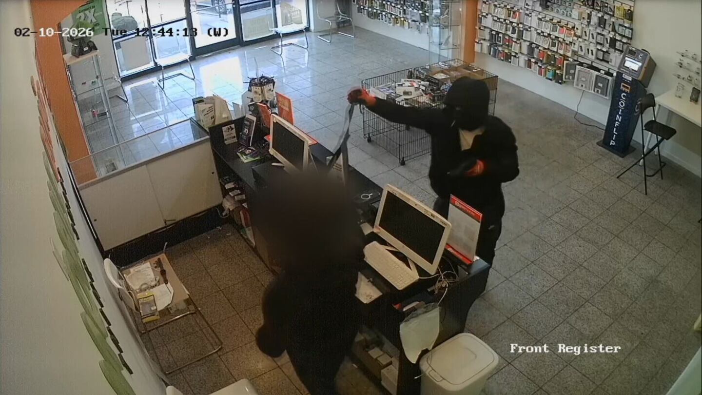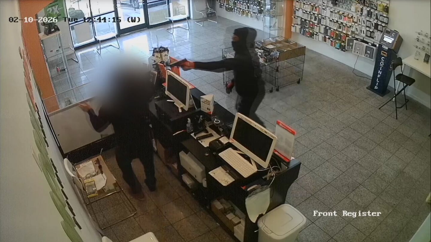 The armed robber stuffed dozens of cellphones into a bag before going behind the counter and emptying the cash register.