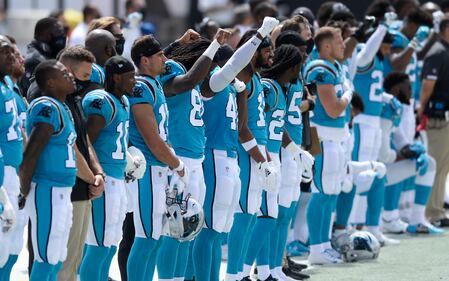 PHOTOS: Carolina Panthers vs. Tampa Bay Buccaneers The Carolina Panthers during the National Anthem before an NFL football game against the Tampa Bay Buccaneers Sunday, Sept. 20, 2020, in Tampa, Fla. (AP Photo/Jason Behnken) ( /AP)