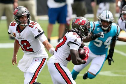 PHOTOS: Carolina Panthers vs. Tampa Bay Buccaneers Tampa Bay Buccaneers quarterback Tom Brady (12) hands off to running back Ronald Jones II (27) during the first half of an NFL football game against the Carolina Panthers Sunday, Sept. 20, 2020, in Tampa, Fla. (AP Photo/Mark LoMoglio) (Mark LoMoglio/AP)