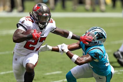 PHOTOS: Carolina Panthers vs. Tampa Bay Buccaneers Tampa Bay Buccaneers running back Ronald Jones II (27) gets stopped by the Carolina Panthers defense during the first half of an NFL football game Sunday, Sept. 20, 2020, in Tampa, Fla. (AP Photo/Jason Behnken) ( /AP)