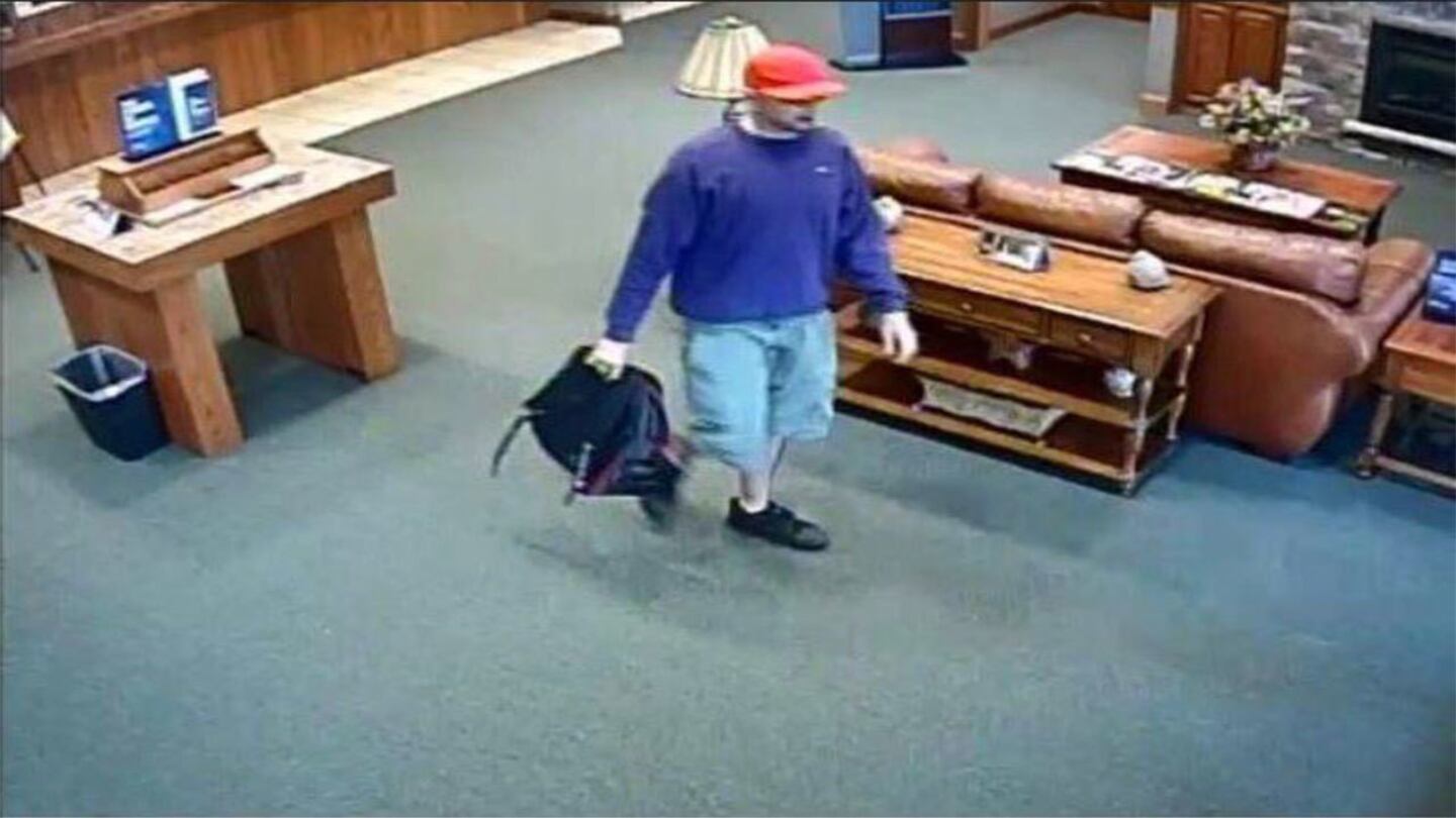 Officers were called to a First Citizens Bank, where surveillance pictures showed a man in a red hat and sunglasses demanding money and then leaving with a backpack.