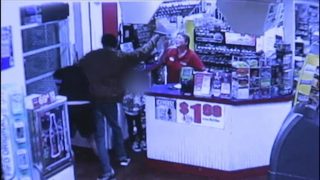 The surveillance video shows the robber put the man in a chokehold and point the gun at the clerk while the 4-year-old boy watched, clutching a drink.