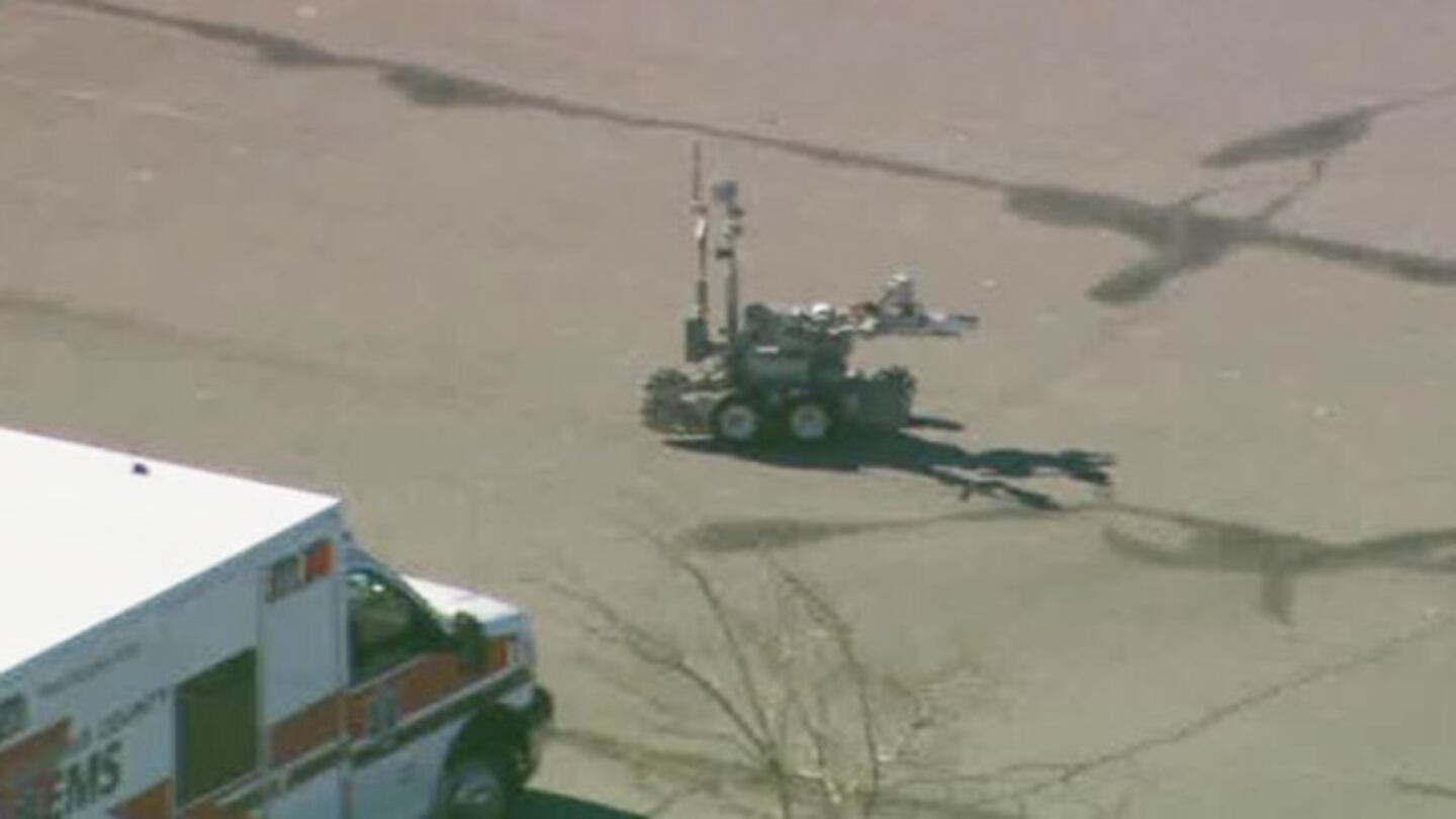 From Chopper 9 Skyzoom, bomb squad members could be seen assembling in the parking lot and sending a robot into the building.
