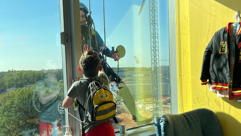 The Joffie Contracting Services, Inc. window cleaners dressed up as Spiderman, Capitan America, and other superheroes to clean the windows at the hospital.