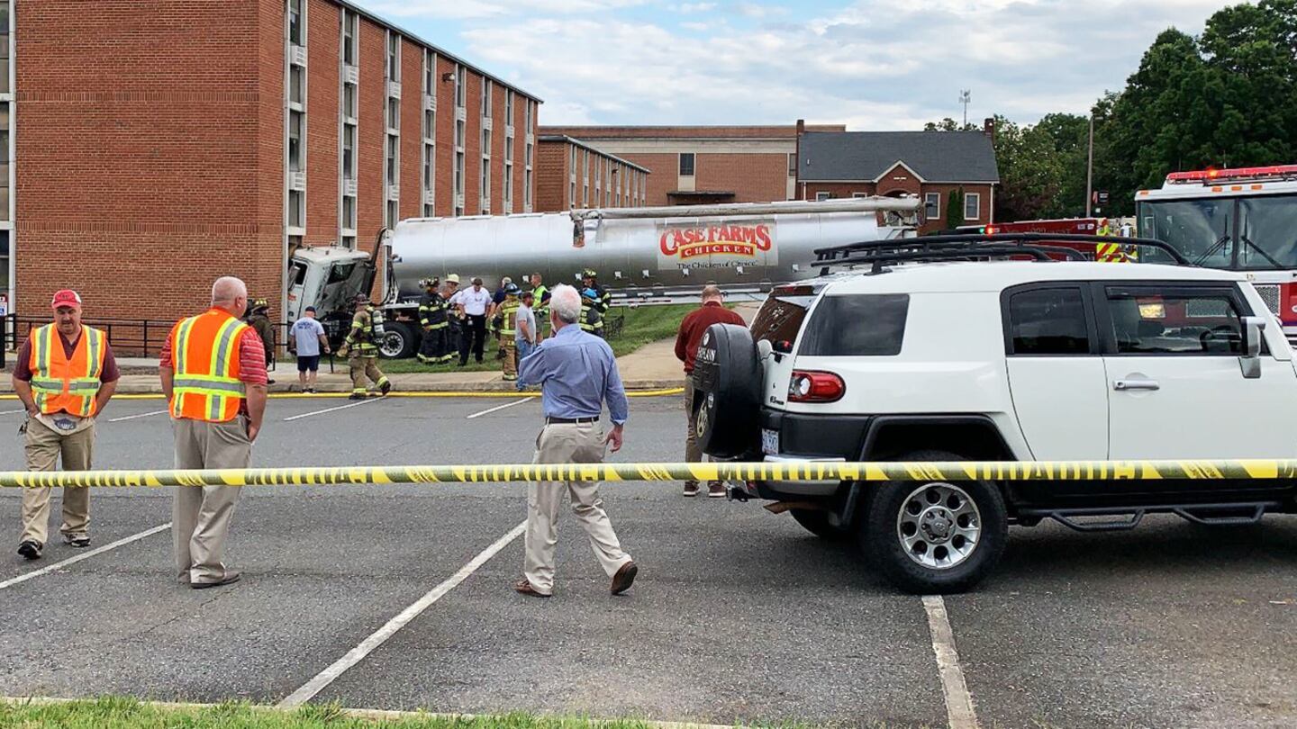 A trucker getting breakfast sees his rig crash into a @gardnerwebb dorm says a university spokesman. The Case Farms feed truck rolled away from the @Hardees downhill into Spangler Hall. No one was in the dorm that was still deemed structurally sound. 80 gallons of diesel spilled. pic.twitter.com/aBT6AELY9i
