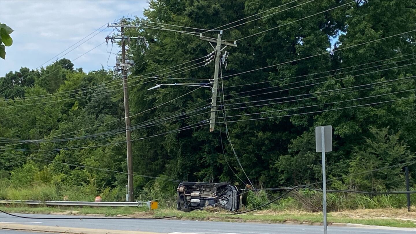A Channel 9′s photographer was at the scene and saw a car overturned and wrapped in wires below a pole that had snapped in half.