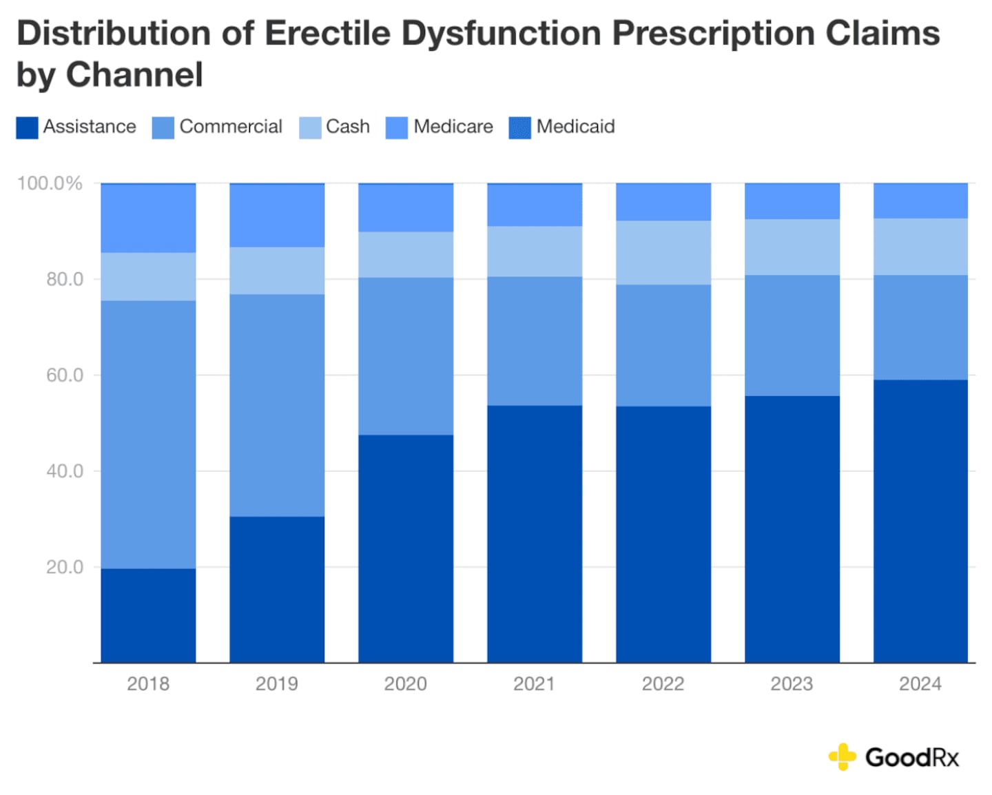 And the way men pay for these prescriptions is shifting. Commercial insurance accounted for over half of ED prescriptions in 2018. By 2024, that number had fallen to just 22%.
