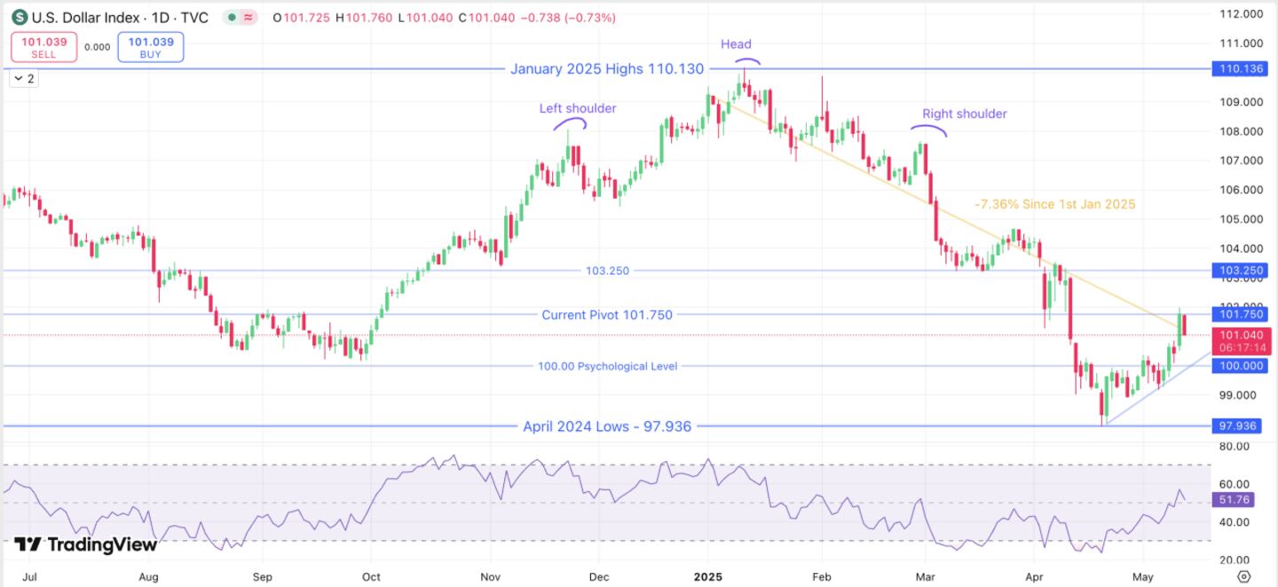 The rally began with very few corrections and lasted until its inauguration speech in January 2025, with highs at 110.14. The end of the impulsive bullish move formed the head of an infamous head and shoulders pattern. The right shoulder was formed in March 2025, as markets feared that unprecedented tariffs would isolate the greenback—this price action sent bearish fears and led to a breakdown below a precedent pivot level at 103.250.