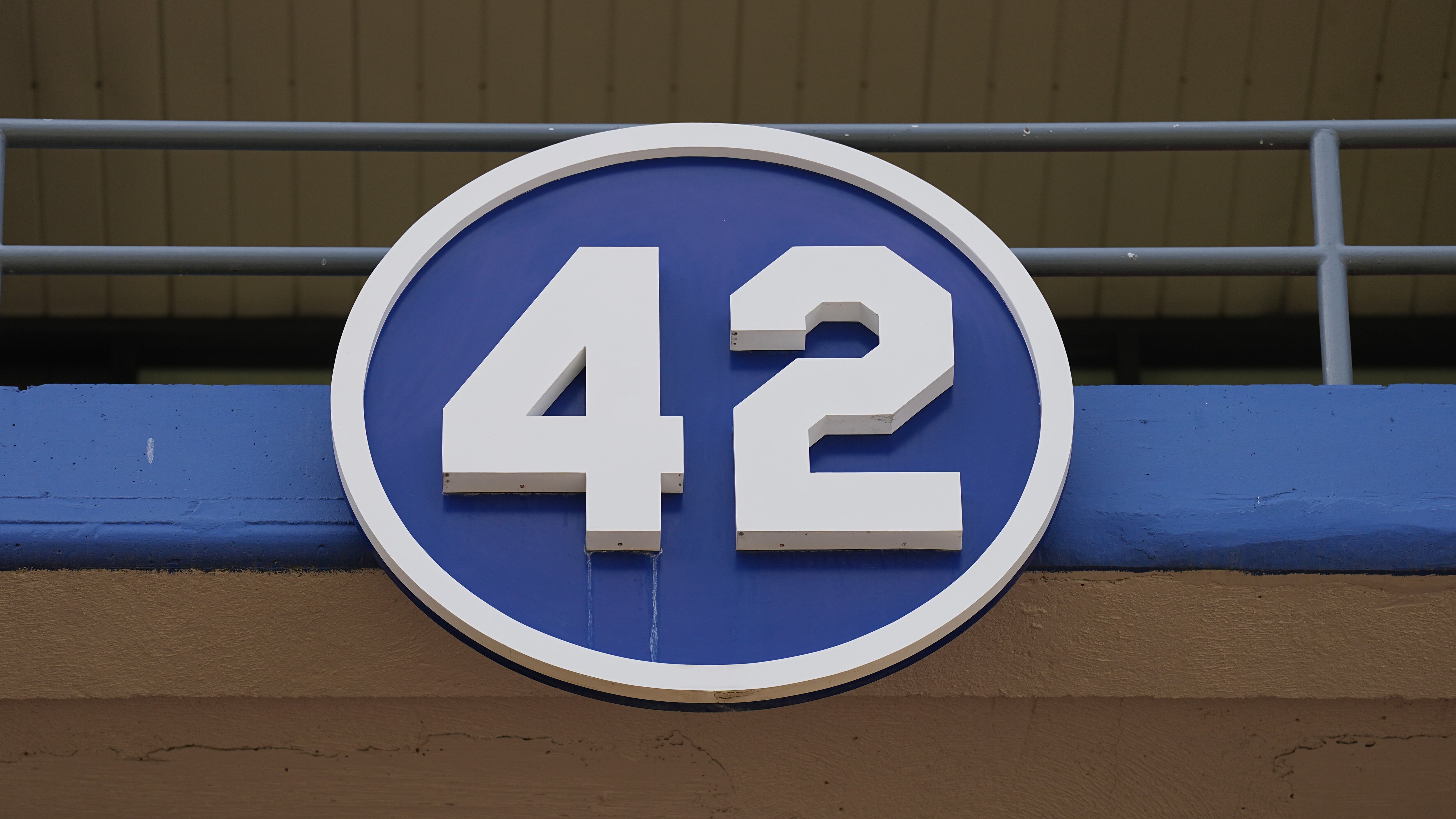 Colorado Rockies v. Los Angeles Dodgers LOS ANGELES, CA - APRIL 15: A detail shot of Jackie Robinson's retired number is seen prior to the game between the Colorado Rockies and the Los Angeles Dodgers at Dodger Stadium on Tuesday, April 15, 2025 in Los Angeles, California. (Photo by Michael Owens/MLB Photos via Getty Images) (Michael Owens/MLB Photos via Getty Images)