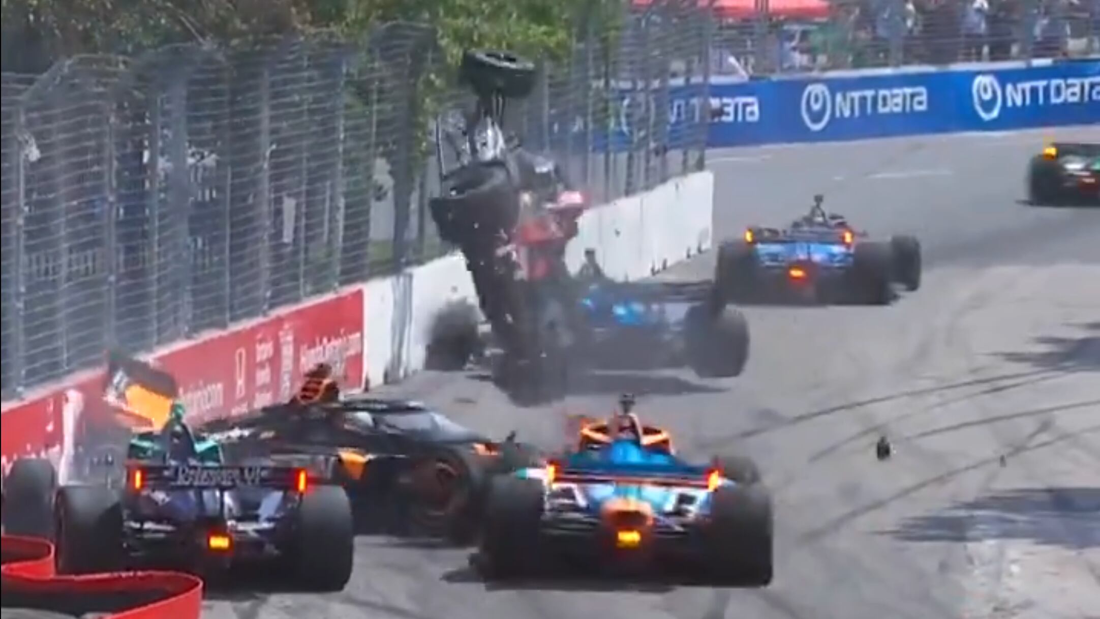 Santino Ferrucci’s car catapulted over Pato O’Ward’s in a wild wreck with 13 laps to go in the Honda Indy Toronto on Sunday.