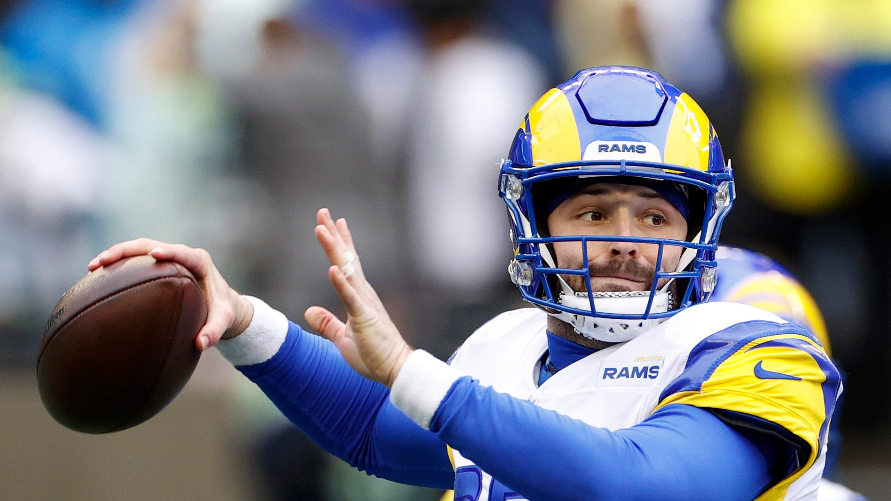Los Angeles Rams v Seattle Seahawks SEATTLE, WASHINGTON - JANUARY 08: Baker Mayfield #17 of the Los Angeles Rams passes during the first quarter against the Seattle Seahawks at Lumen Field on January 08, 2023 in Seattle, Washington. (Photo by Steph Chambers/Getty Images)