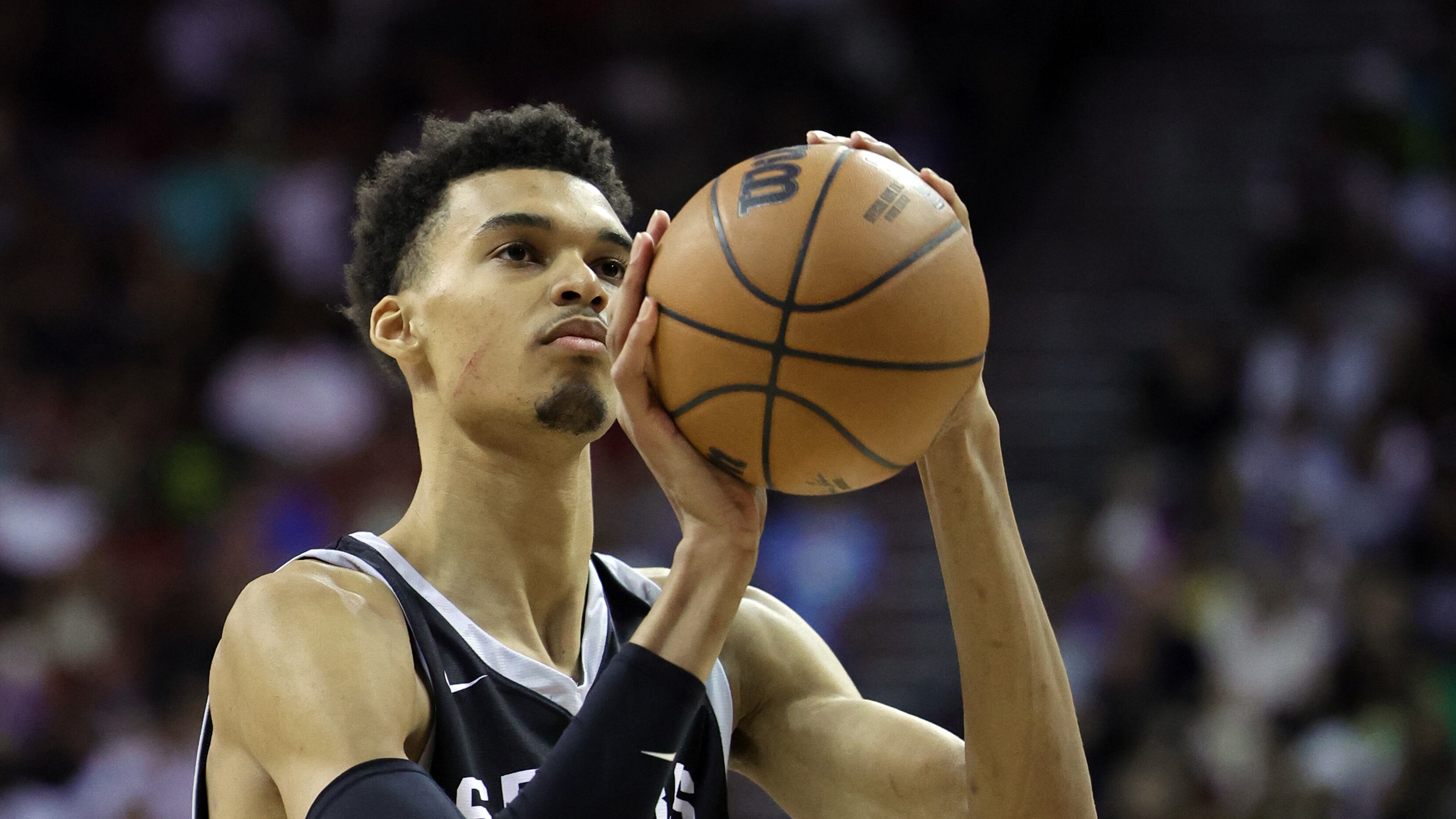 2023 NBA Summer League - San Antonio Spurs v Portland Trail Blazers LAS VEGAS, NEVADA - JULY 09: Victor Wembanyama #1 of the San Antonio Spurs shoots a free throw against the Portland Trail Blazers in the second half of a 2023 NBA Summer League game at the Thomas & Mack Center on July 09, 2023 in Las Vegas, Nevada. NOTE TO USER: User expressly acknowledges and agrees that, by downloading and or using this photograph, User is consenting to the terms and conditions of the Getty Images License Agreement. (Photo by Ethan Miller/Getty Images) (Ethan Miller/Getty Images)