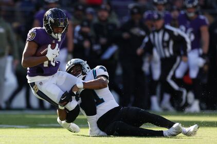 Carolina Panthers v Baltimore Ravens BALTIMORE, MARYLAND - NOVEMBER 20: Demarcus Robinson #10 of the Baltimore Ravens gets tackled by Jeremy Chinn #21 of the Carolina Panthers in the first quarter at M&T Bank Stadium on November 20, 2022 in Baltimore, Maryland. (Photo by Rob Carr/Getty Images) (Rob Carr/Getty Images)