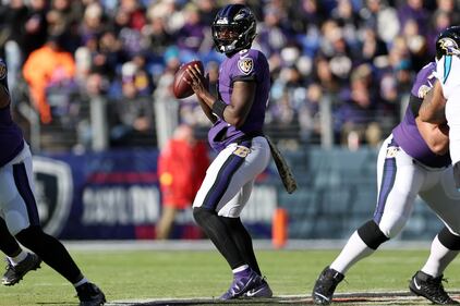 Carolina Panthers v Baltimore Ravens BALTIMORE, MARYLAND - NOVEMBER 20: Lamar Jackson #8 of the Baltimore Ravens looks to pass in the first quarter of a game against the Carolina Panthers at M&T Bank Stadium on November 20, 2022 in Baltimore, Maryland. (Photo by Scott Taetsch/Getty Images) (Scott Taetsch/Getty Images)