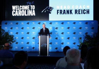 Carolina Panthers Introduce Frank Reich as Head Coach CHARLOTTE, NORTH CAROLINA - JANUARY 31: Frank Reich speaks with the media during the Carolina Panthers head coach introduction at Bank of America Stadium on January 31, 2023 in Charlotte, North Carolina. (Photo by David Jensen/Getty Images)