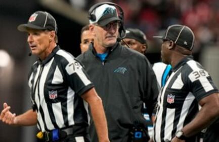 Carolina Panthers head coach Frank Reich speaks with field judge Anthony Jeffries (36) during the first half of an NFL football game against the Atlanta Falcons, Sunday, Sept. 10, 2023, in Atlanta. (AP Photo/Brynn Anderson)
