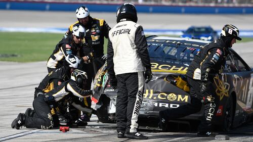 Kyle Busch The pit crew works on Kyle Busch's car after he touched the wall during the NASCAR Cup Series auto race at Texas Motor Speedway in Fort Worth, Texas, Sunday, Sept 25, 2022. (AP Photo/Randy Holt) (Randy Holt/AP)
