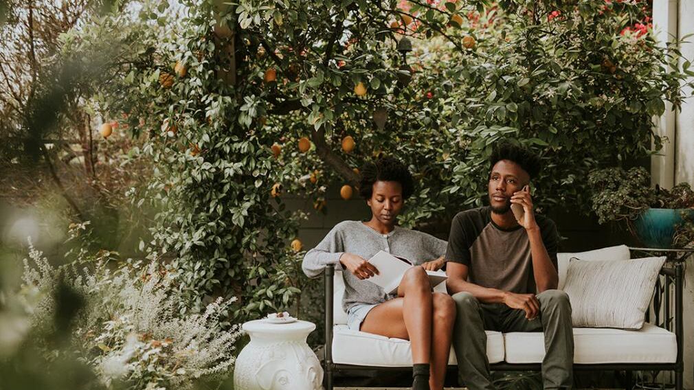 A couple sits together on a sunny park bench. He appears to be studying the passing clouds; she's absorbed in a novel. Some passersby might think, "How sweet." Others might see them as bleak.