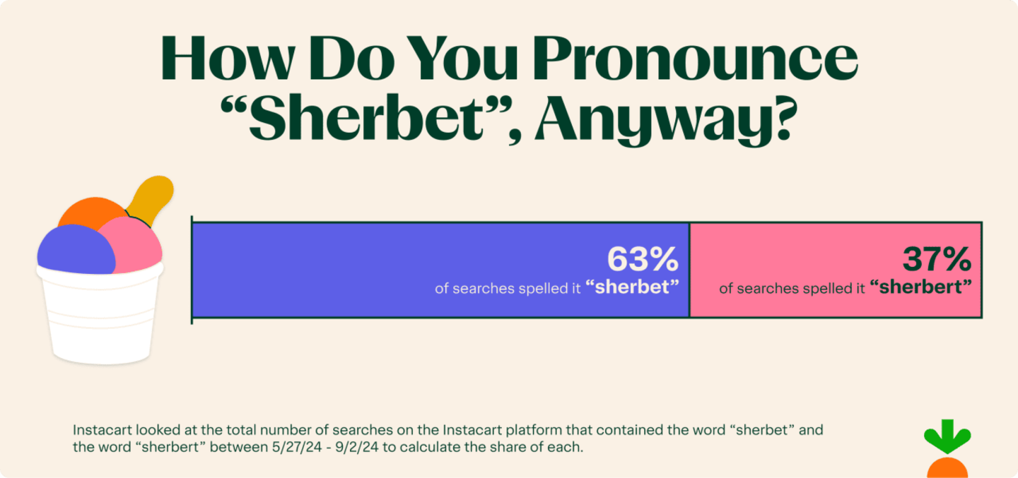 When it comes to this fruity treat, Americans are split on pronunciation and spelling. During last year's summer season, 63% of Instacart searches spelled it "sherbet," while 37% went with "sherbert," sneaking in a second "r". The verdict? While some dictionaries now list sherbert as a variant, sherbet (SHER-but) is technically the standard spelling and pronunciation. But don't worry, we're not here to correct you, especially if you're bringing dessert…