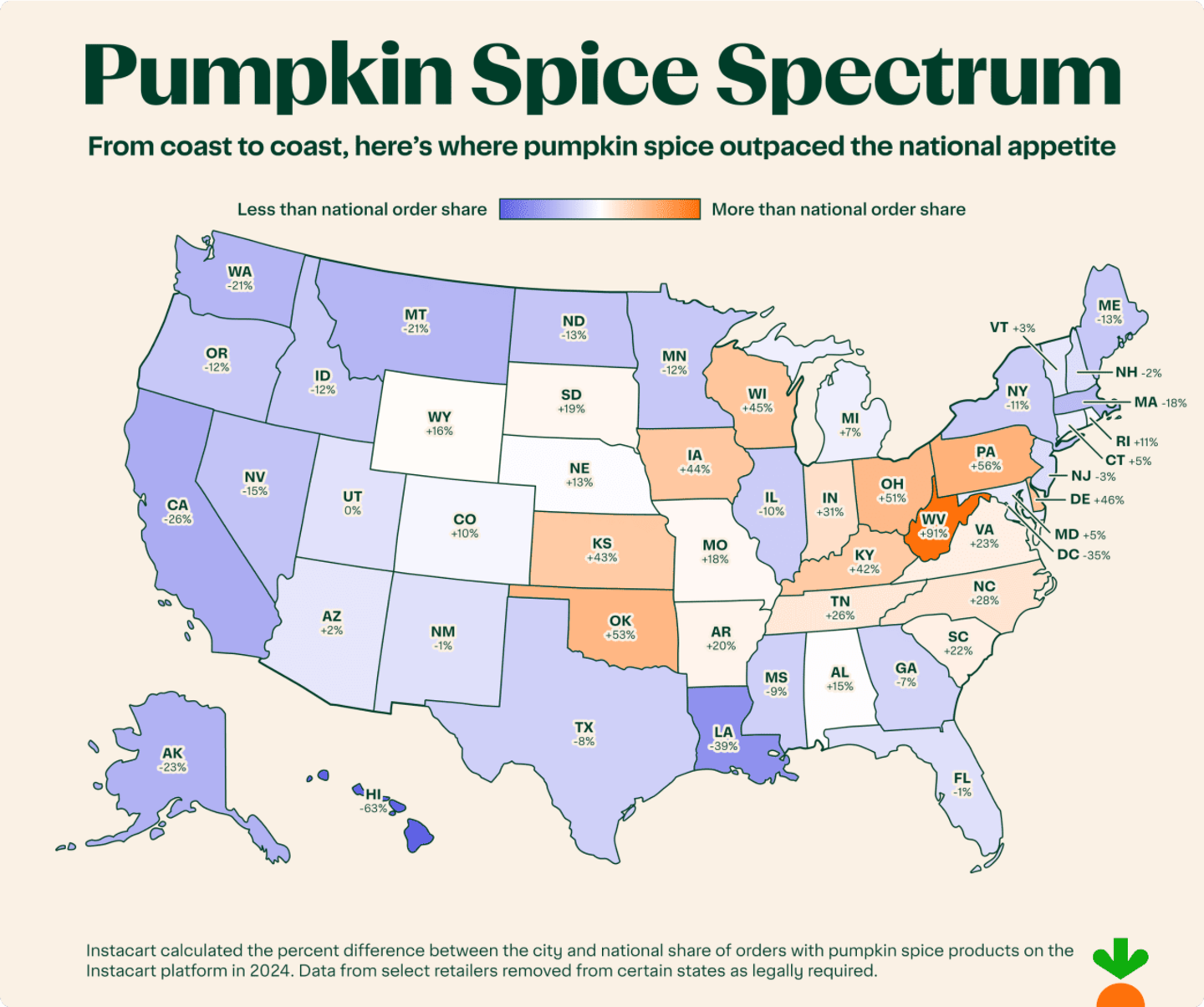 Drumroll, please…West Virginia tops the pumpkin spice leaderboard, ordering 91% more pumpkin spice products than the national average. Pennsylvania (+56%) and Oklahoma (+52%) round out the top three. On the flip side, Hawai'i takes the title for the least pumpkin-spicy state, ordering 63% less than average.