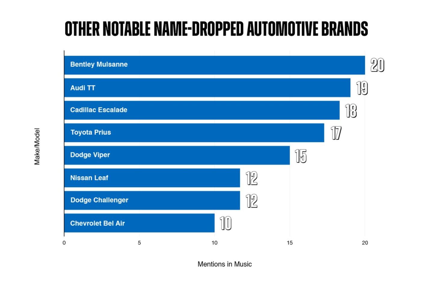 Drilling deeper into the lyric sheets reveals even more unique shoutouts, such as the Bentley Mulsanne (20 mentions), which was discontinued in 2020; the Audi TT (19 mentions); and the Dodge Viper (15 mentions). The Cadillac Escalade gets 18 mentions, which isn’t a big surprise given that the luxury SUV’s sharp, boxy lines and classic American status have made it a staple in hip-hop and pop music videos.