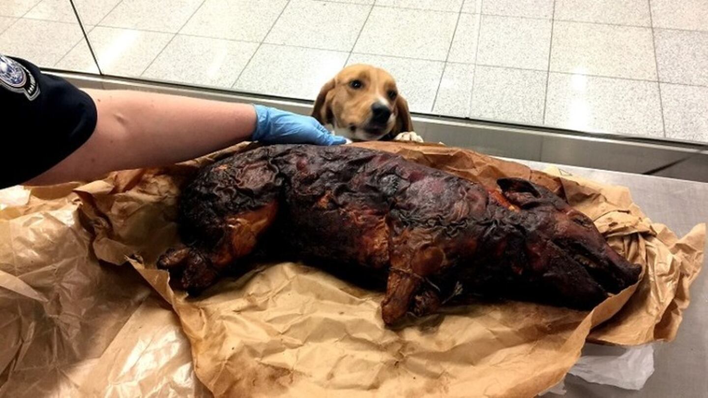 In 2016, a K9 beagle named Joey detected a whole roasted pig in the baggage of a traveler from Peru.