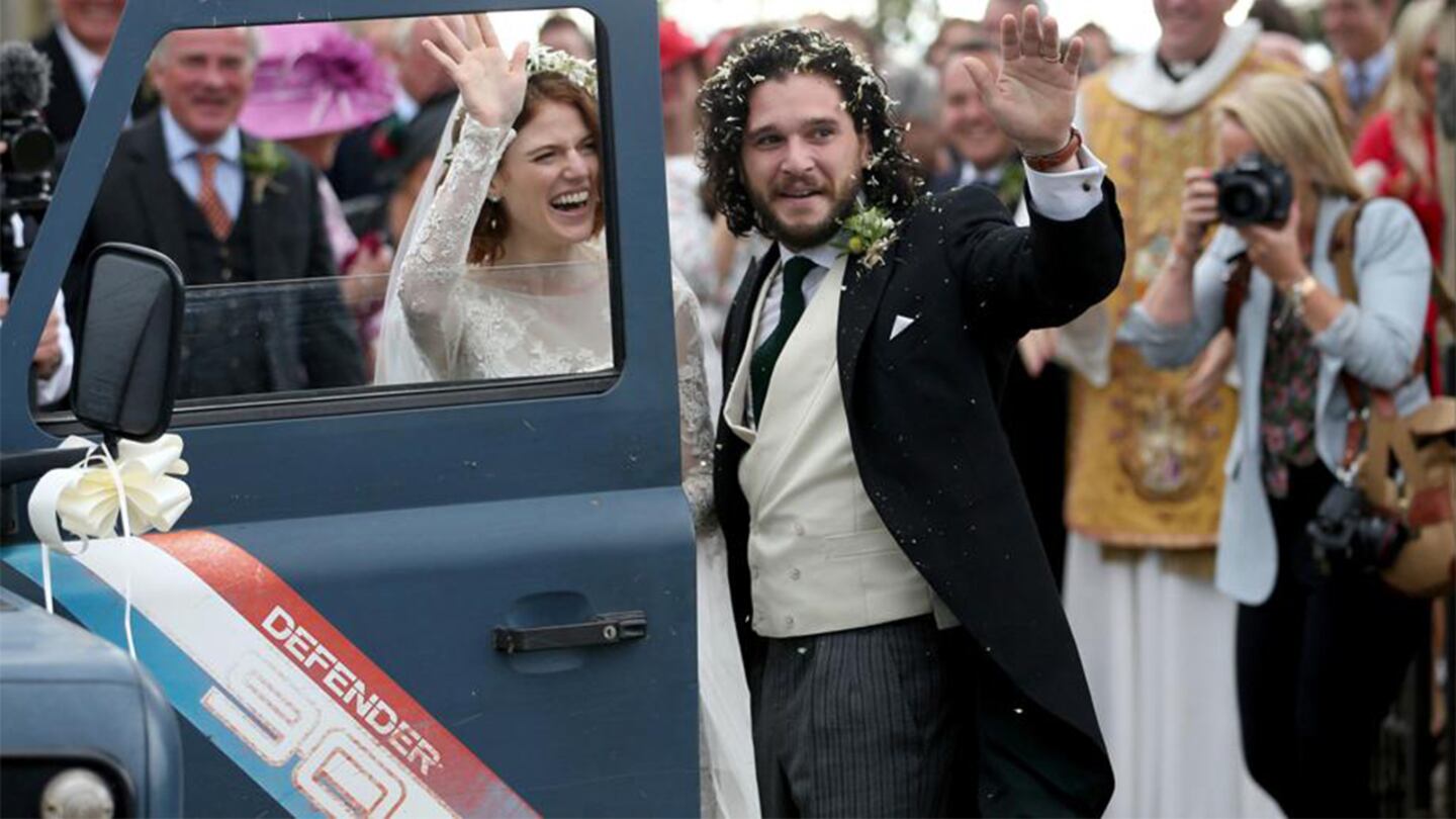 “Game of Thrones” co-stars Kit Harington and Rose Leslie married at an ancestral castle in Scotland on Saturday.