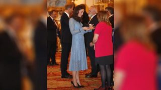 The duchess wore a blue frock and black heels as she attended a reception at St. James Palace, her tiny baby bump on display. The reception marks the first time Catherine has been seen in public since announcing her pregnancy in early September.