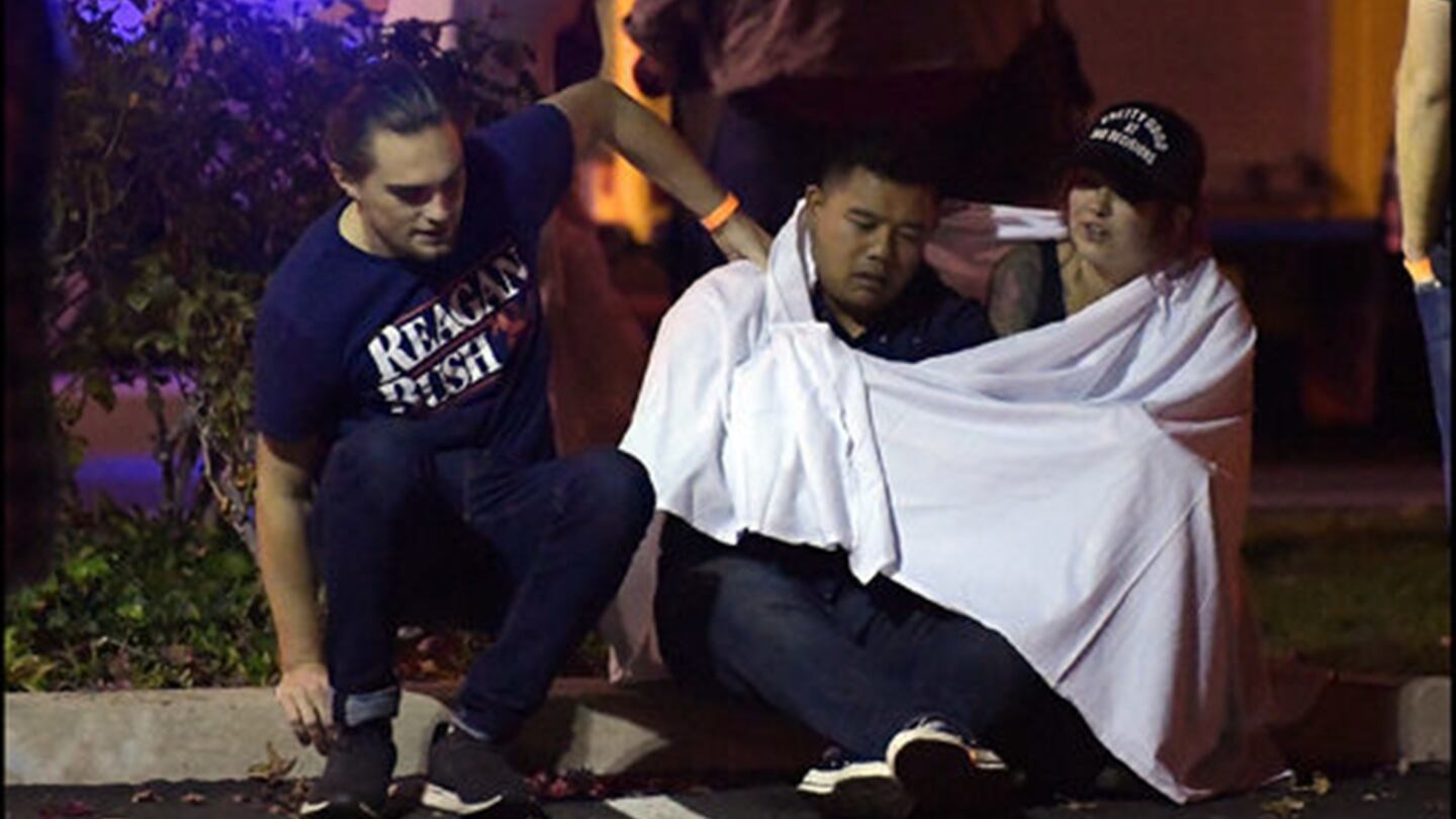 People comfort each other as they sit near the scene in Thousand Oaks, Calif. where a gunman opened fire inside a country dance bar crowded with hundreds of people on "college night," wounding 11 people including a deputy who rushed to the scene.