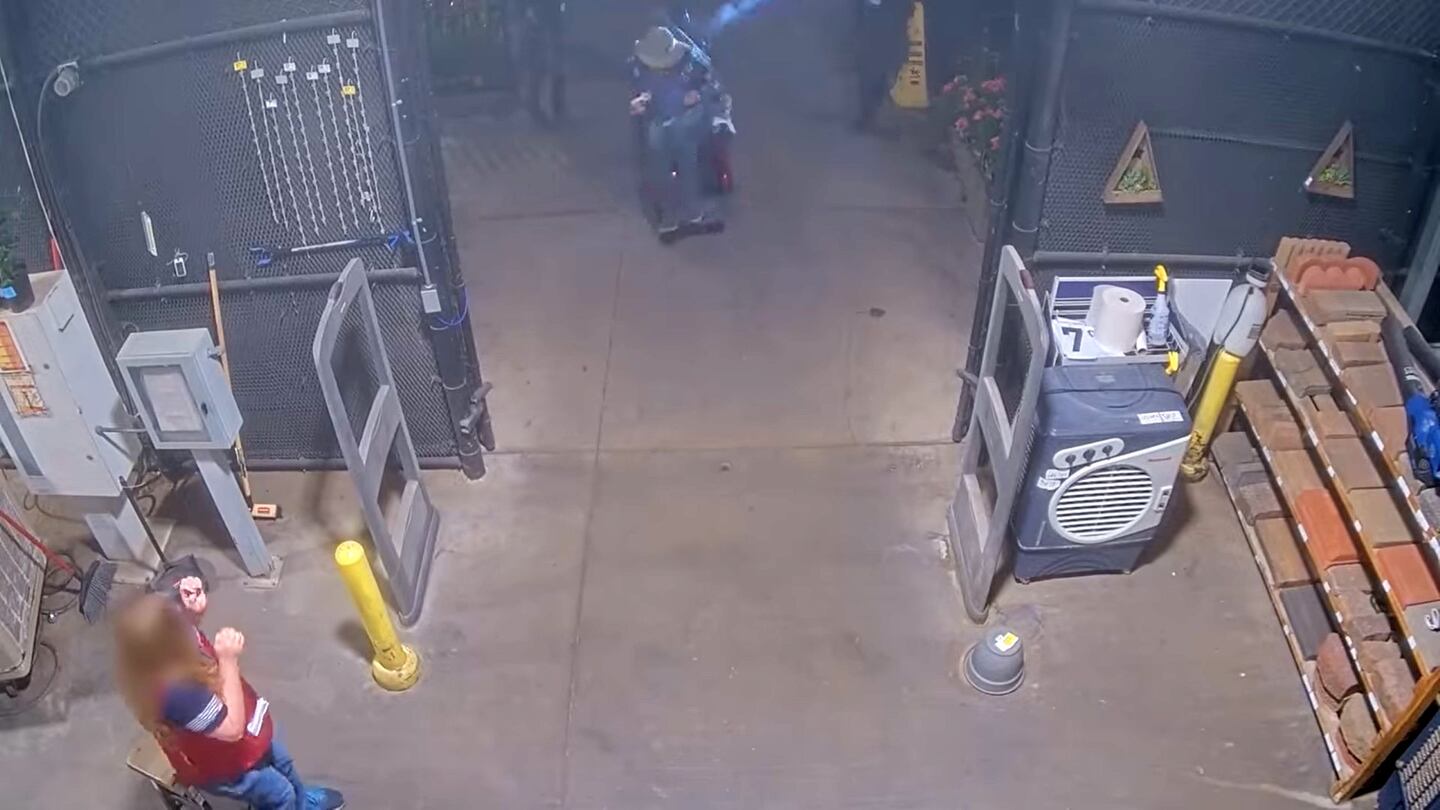 The final portion of the footage shows the shooting from just inside the garden center entrance to Lowe’s. A female employee sits on a stool just inside the fence, her arms casually crossed across her chest.
