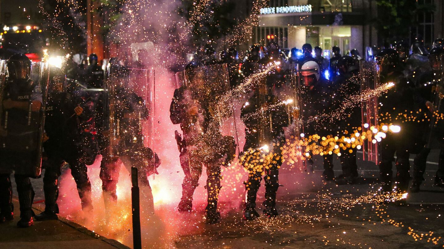 The protests began peacefully but grew violent overnight, St. Louis authorities said. According to The Associated Press, police officers were pelted with rocks and fireworks.