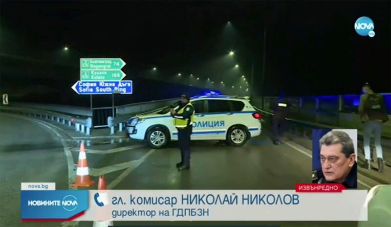 Photos: Bulgaria bus crash, fire leave dozens dead This image made from video provided by Nova TV shows road signs and police roadblock near scene of bus crash in Bosnek, Bulgaria, Tuesday, Nov. 23, 2021. A bus crash in western Bulgaria early Tuesday has killed dozens of people, authorities said. (Nova TV via AP)
