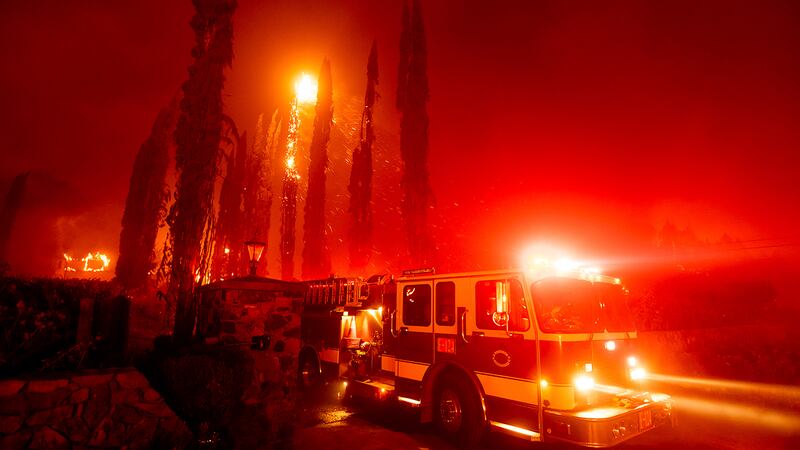 New wildfires scorch California An emergency vehicle drives along Silverado Trail as the Glass Fire burns in St. Helena, Calif., on Sunday, Sept. 27, 2020. (Noah Berger/AP)