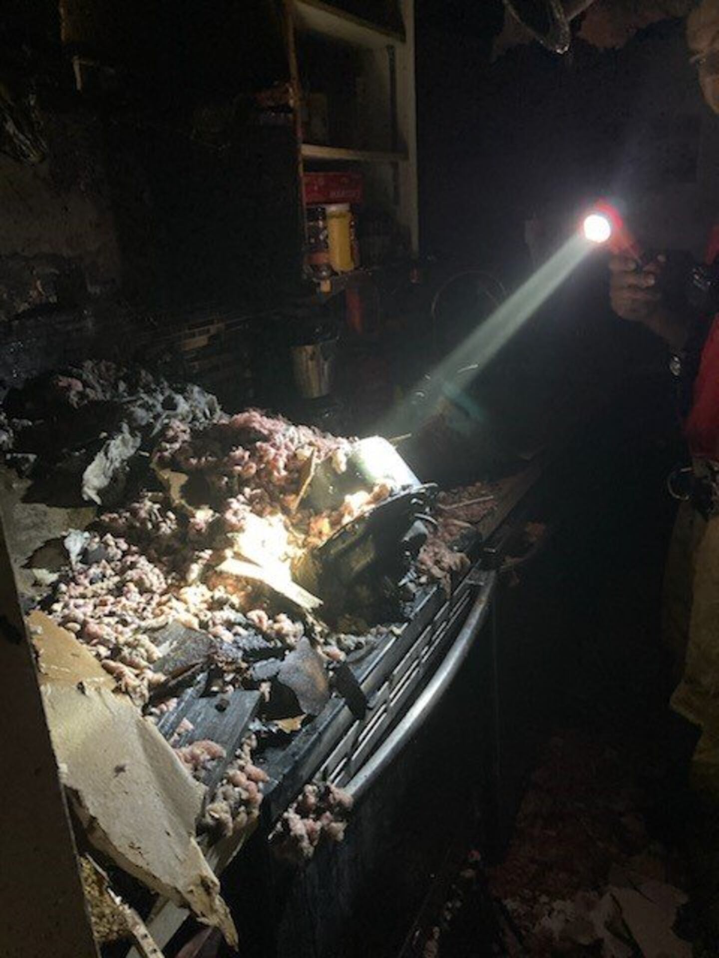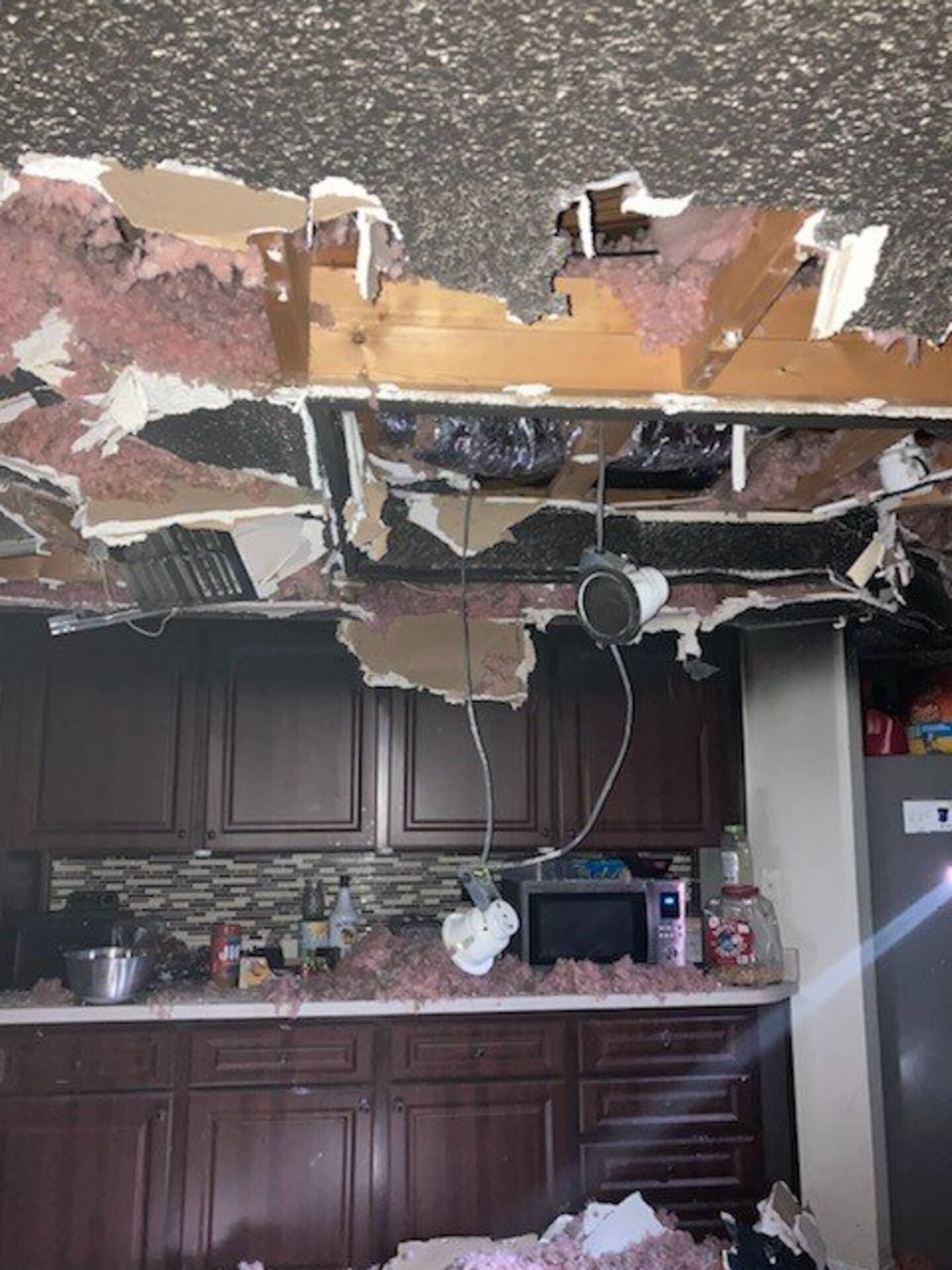 Photos shared by HCFES on Facebook show the extensive damage caused by the fire to the kitchen and roof of the home.