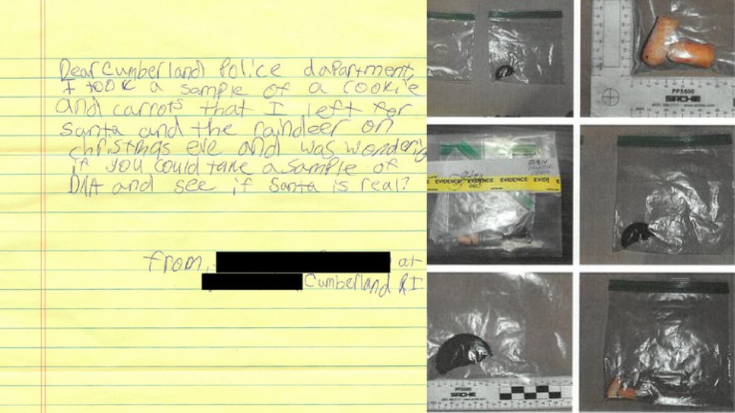 She wrote the Cumberland Police department, saying, “Dear Cumberland Police department, I took a sample of a cookie and carrots that I left for Santa and the raindeer on christmas eve and was wondering if you could take a sample of DNA and see if Santa is real?” the newspaper reported.