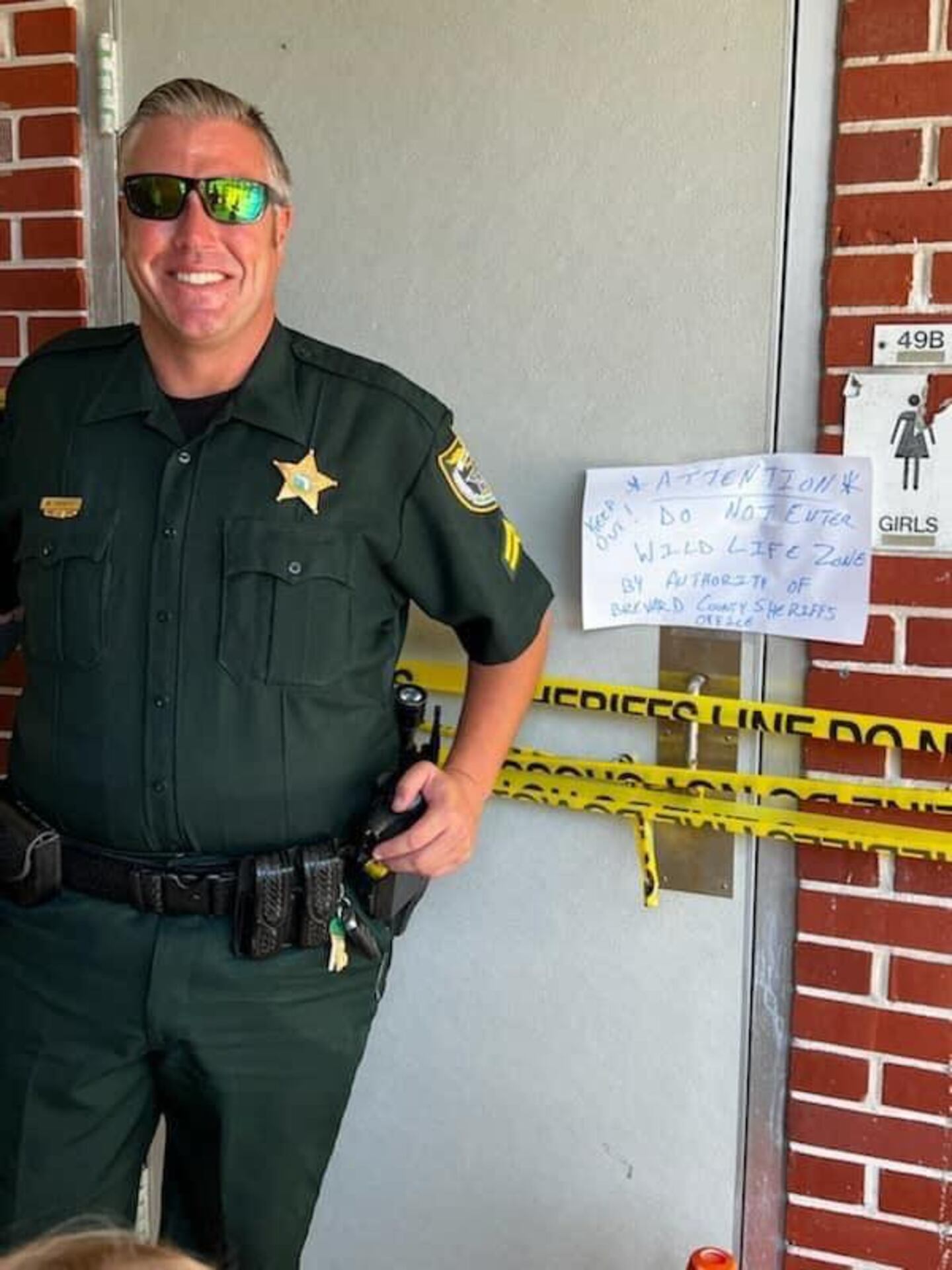 The Brevard County Sheriff’s Office shared pictures of the mischievous marsupial in a Facebook post, with a caption saying that the school resource officer, upon arriving at Indialantic Elementary, sprang into action “as he was notified that an intruder was on campus and had barricaded themselves in the girls’ bathroom!”