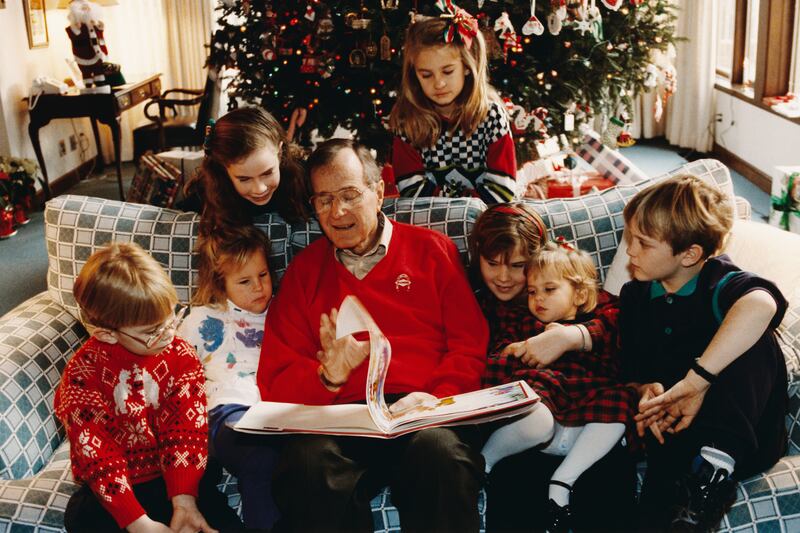 Photos: Former first daughter Barbara Bush through the years 1991: President George H. W. Bush reads to grandchildren Pierce, Marshall, Barbara, Lauren, Jenna, Ashley Bush and Sam LeBlond at Camp David on Christmas Eve. (Lee Corkran/Sygma via Getty Images)