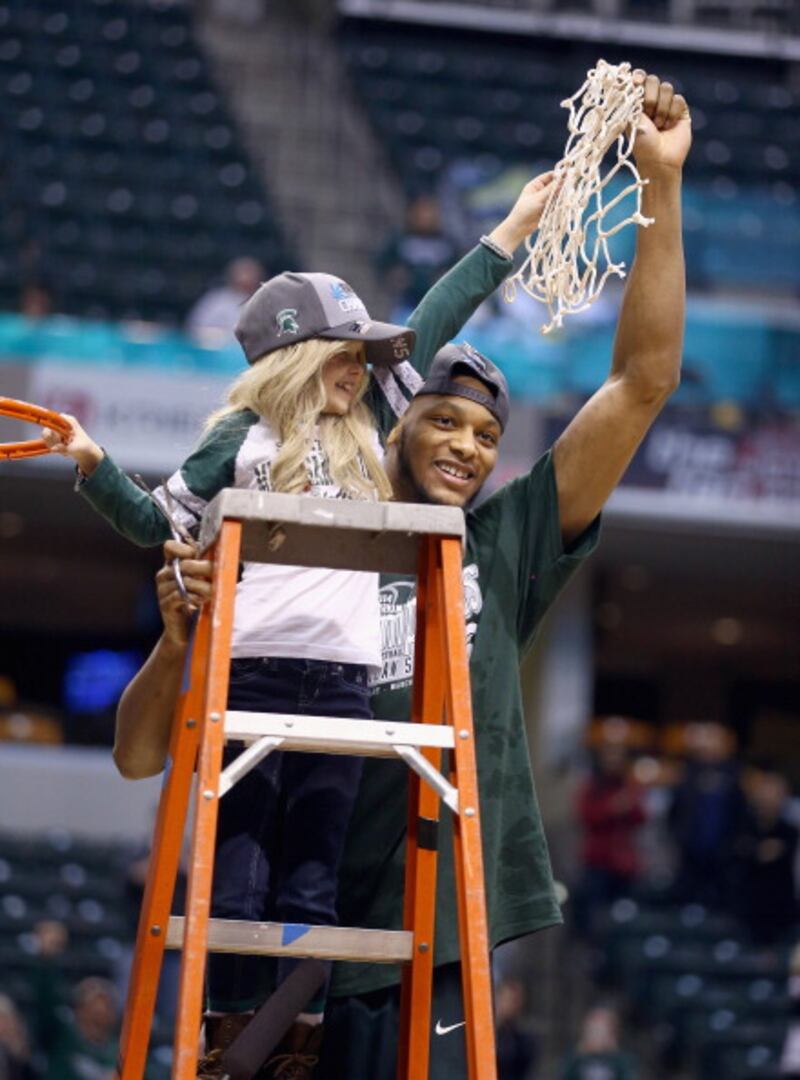 Through the years Adreian Payne #5 of the Michigan State Spartans celebrates with 8 year old Lacey Hullsworth after the 69-55 win over the Michigan Wolverines during the finals of the Big Ten Basketball Tournament at Bankers Life Fieldhouse on March 16, 2014 in Indianapolis, Indiana. (Photo by Andy Lyons/Getty Images) (Andy Lyons/Getty Images)